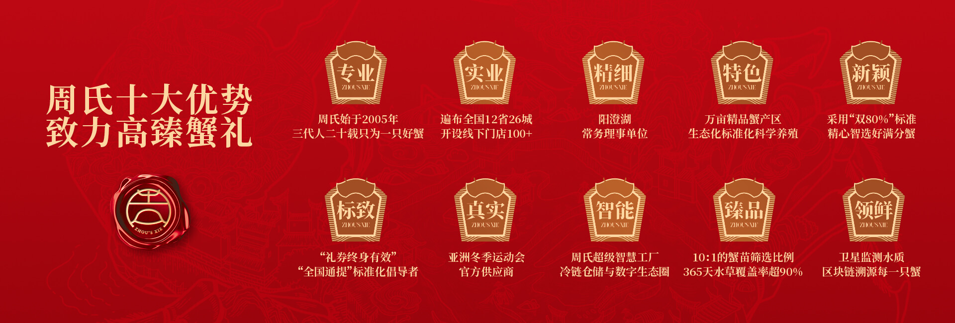周氏水產精品大閘蟹,14年匠心沉淀,全國87家直營門店,100只大閘蟹只精選最優50只。不虛標規格,不玩???
